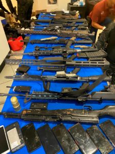 En la detención también se aseguraron 8 vehículos; 16 armas de diversos calibres, dos de ellas de alto poder; más de 3,900 cartuchos útiles de diversos calibres; 80 cargadores; 8 chalecos balísticos; 2 granadas y equipamiento táctico, así como un paquete con hierba verde con características similares a las de la marihuana.