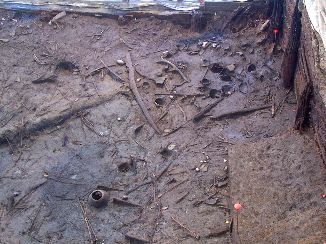 La construcción, que mide 12 metros de largo, 7 de ancho y 3 de profundidad, fue encontrada en 2004. Es una piscina excavada en una colina y luego revestida con roble, olmo y nogal, formando dos tanques superpuestos. En el fondo yacen varios objetos de cerámica y madera.