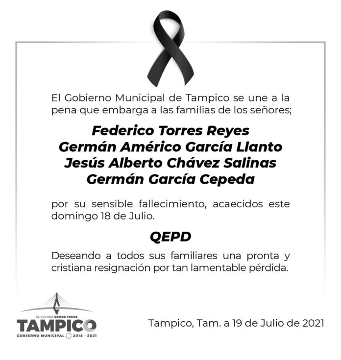 Mediante un comunicado, el Gobierno Municipal de Tampico, expresó su pesar por lo acontecido y destacó que pondrá al servicio de los familiares todo tipo de apoyo para sobrellevar esta lamentable tragedia.