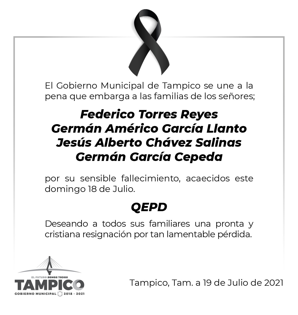 Por último, la administración municipal envió sus respetos y condolencias a los familiares de los señores; Federico Torres Reyes, Germán Américo García Llanto, Jesus Alberto Chávez Salinas y Germán García Cepeda, quienes lamentablemente perdieron la vida en este trágico accidente.