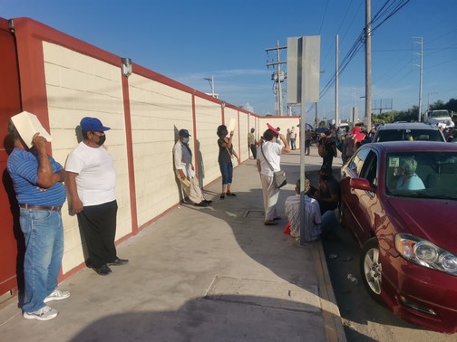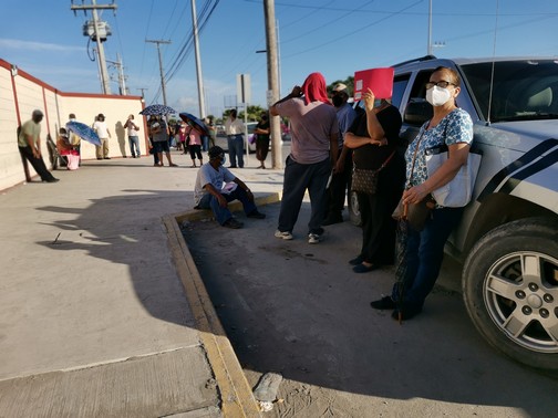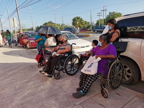 Cabe señalar que en esta fila se encontraban personas en sillas de rueda que tuvieron que ponerse atrás de unos vehículos para cubrirse del fuerte sol que se registro.