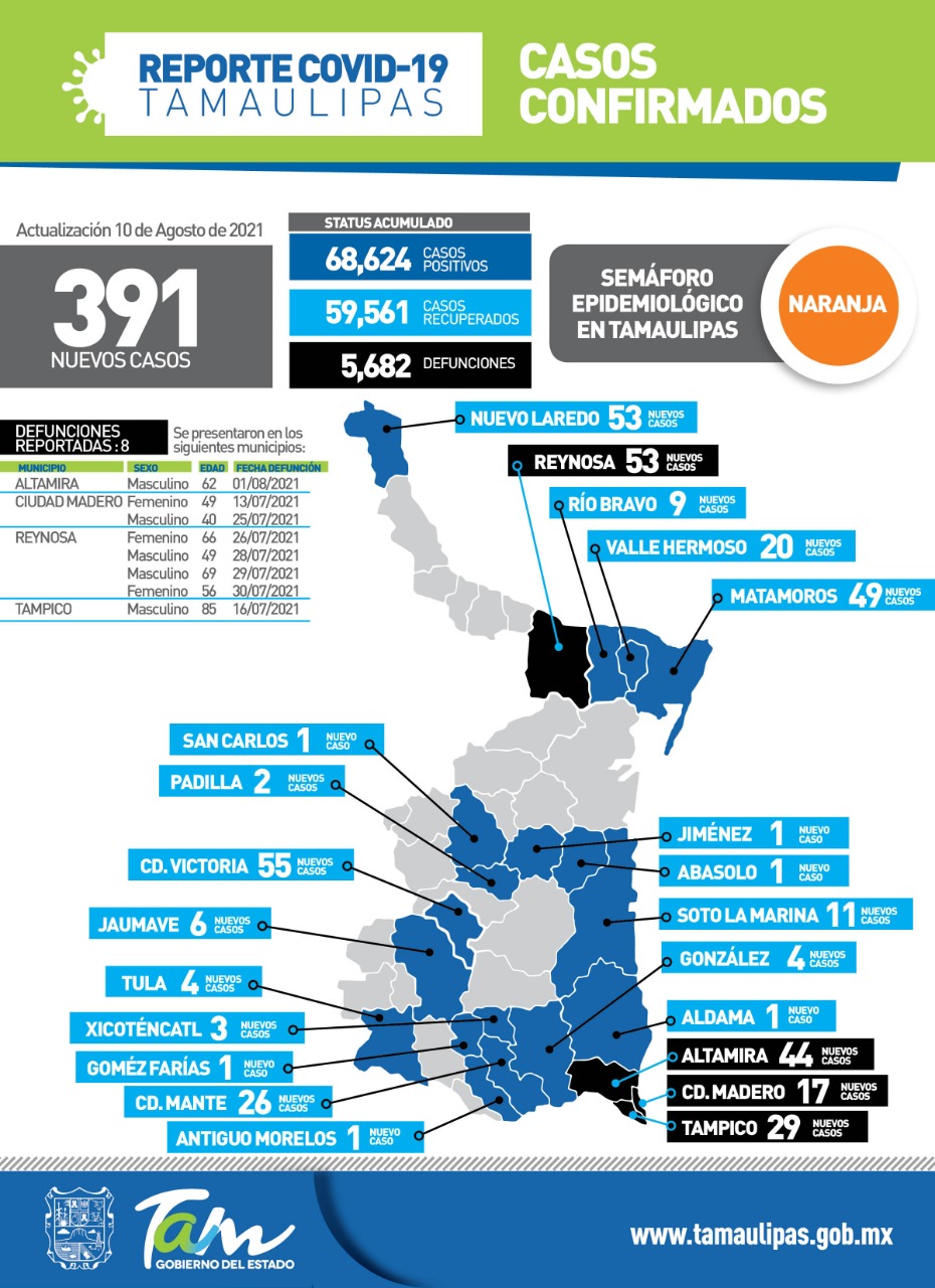 CIUDAD VICTORIA, Tamaulipas. – Tamaulipas registró hoy 391 nuevos casos y 8 fallecimientos por COVID-19, informó desde esta ciudad capital, la secretaria de Salud, Gloria Molina Gamboa al actualizar el estado de la pandemia. La funcionaria estatal pidió a la población no bajar la guardia y extremar las medidas de seguridad sanitaria, principalmente entre los jóvenes, como son el uso del cubrebocas, la sana distancia y el lavado frecuente de manos, ante el aumento en el número de casos y la circulación de variantes cada vez más contagiosas, entre ellas la Alfa, Beta, Gamma y Delta, además de la cepa original.