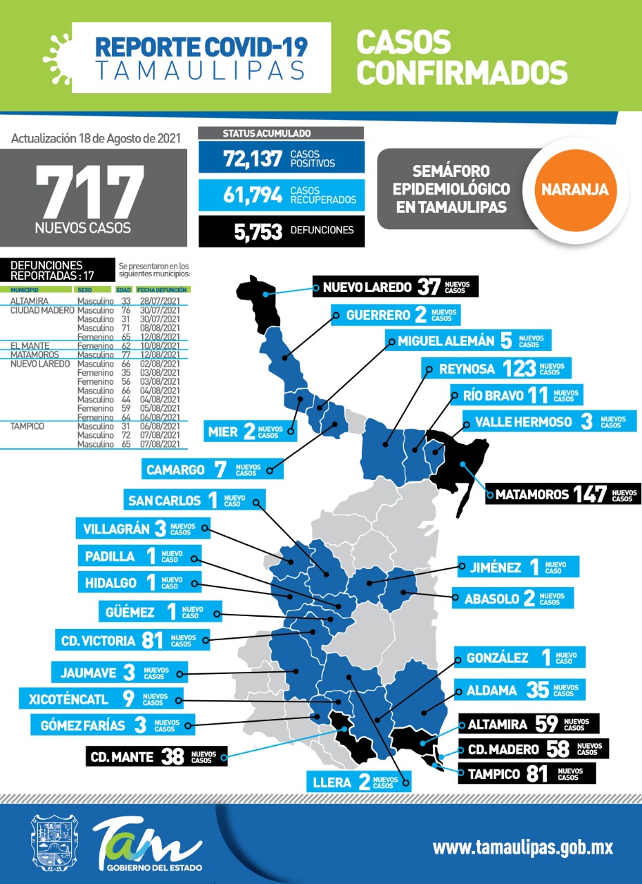 En cuanto a los decesos la dependencia informó que se registraron 17 en los municipios de, Altamira, Ciudad Madero, el Mante, Matamoros, Nuevo Laredo, y Tampico, registrando así Tamaulipas un acumulado de 5 mil 753 decesos en año y medio de pandemia.