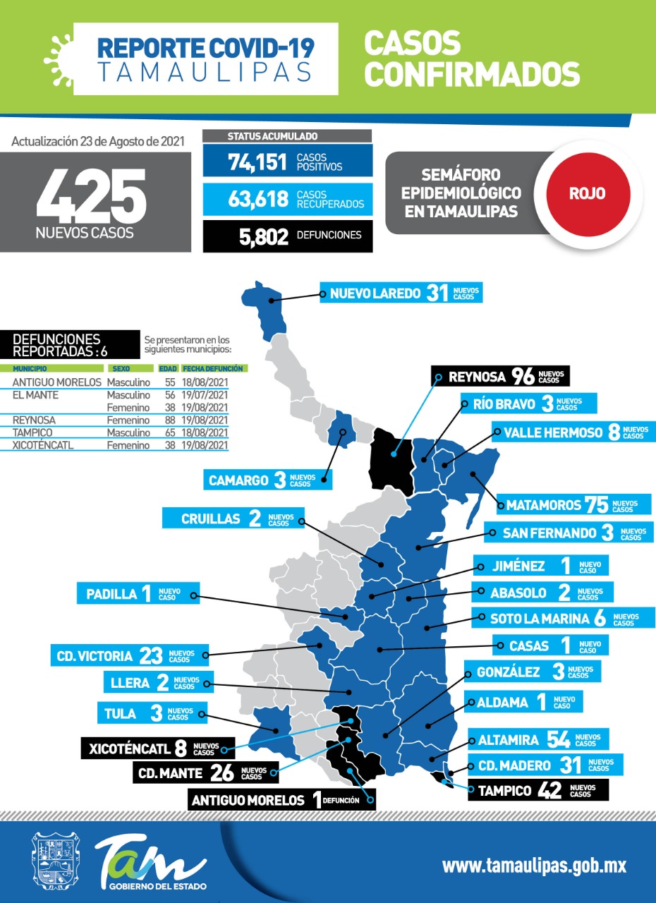 CIUDAD VICTORIA, Tamaulipas.-Durante las últimas 24 horas Tamaulipas registró 425 nuevos casos y 6 fallecimientos por la tercera ola de COVID-19, informó la secretaria de Salud, Gloria Molina Gamboa, quien insistió en su llamado a “no salir de casa si no es estrictamente necesario” y adaptarse a la nueva realidad ya que la vida cotidiana no será la misma por algún tiempo.