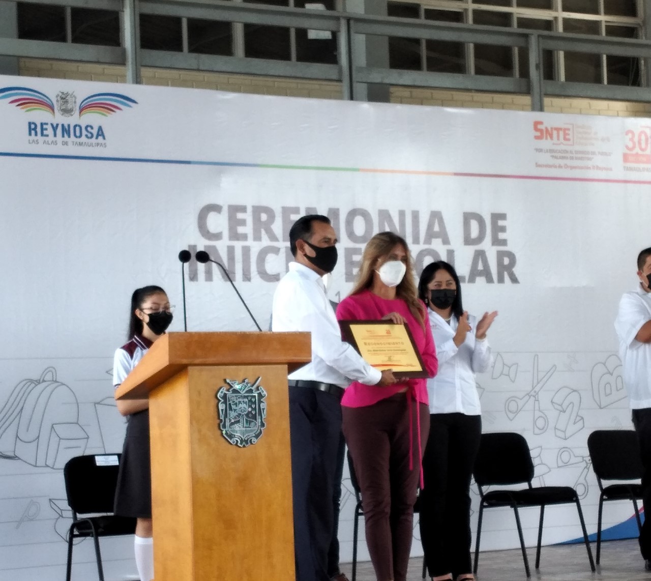 Reynosa, Tamaulipas.- En el marco de la ceremonia del arranque del ciclo escolar 2021- 2022, que se llevó a cabo este lunes en el CETIS 71, encabezado por la alcaldesa Maki Ortiz Domínguez, el Secretario de Organización II del SNTE, Jorge Guadalupe Acuña Tobías, entregó a la edil un reconocimiento ‘a quien ha sido una fuerte impulsora a la educación en este municipio, y un ejemplo para todas las administraciones que habido anteriormente”.
