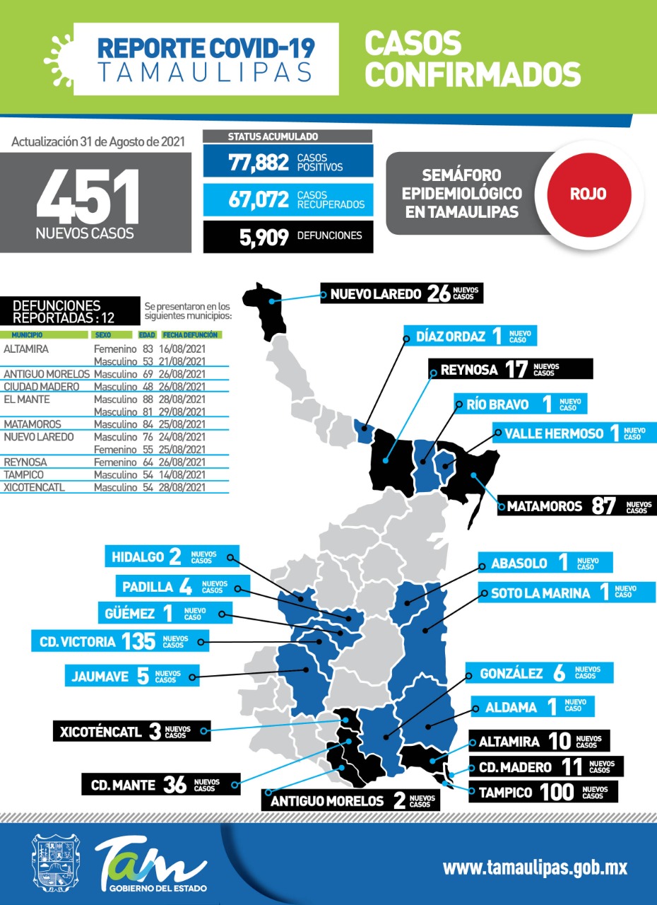 Ciudad Victoria, Tamaulipas. – Tamaulipas registró este martes 451 nuevos casos de COVID-19 y 12 fallecimientos, informó la secretaria de Salud, Gloria Molina Gamboa luego de advertir que los contagios pueden continuar aumentando de no atender todas las medidas de seguridad sanitaria tanto en el hogar como en el trabajo y los espacios públicos.