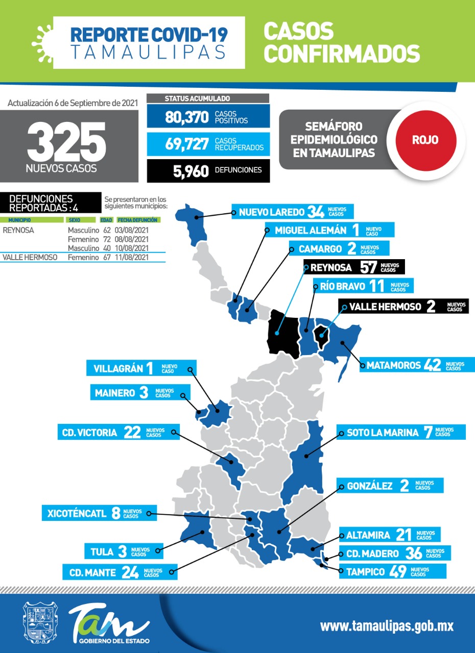 Tamaulipas sumó este lunes 325 nuevos casos de COVID-19 a su conteo oficial