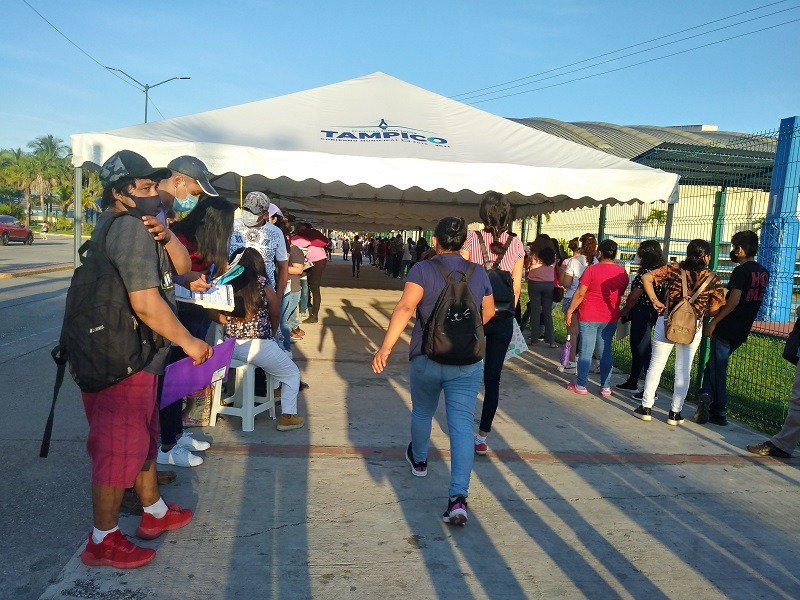 Pedro Romero Sánchez, Secretario de Protección Civil del Ayuntamiento de Tampico, informó que a las 08:00 horas ya se contaba con más de mil jóvenes en el Polideportivo haciendo fila, luego de que esas instalaciones tienen capacidad para que ingresen 700 personas y se tienen programadas aplicar 3 mil vacunas en ese lugar a lo largo de este día e igual cantidad en cada una de los otros dos módulos de vacunación.