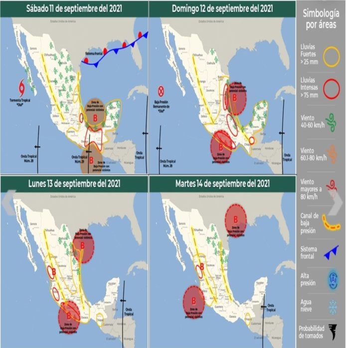 El día lunes 13 la posibilidad de lluvia se mantiene entre 40% y 45% con temperaturas de 25 Centígrados como mínima y maxima de 34, incrementándose al 70% el índice de lluvias para el día martes 14 y 25 a 34 Celsius, por lo cual en relación a los efectos de la baja presión, se recomienda a peatones y automovilistas no cruzar por lugares identificados como riesgo para acumulación de agua.