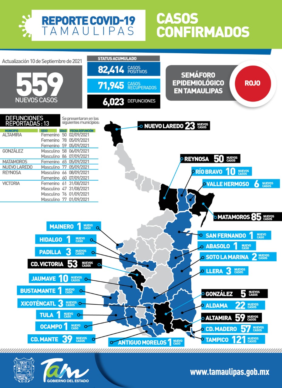 CIUDAD VICTORIA, Tamaulipas. – Tamaulipas sumó hoy 559 nuevos casos de COVID-19 y 13 fallecimientos, informó desde esta ciudad capital, la secretaria de Salud, Gloria Molina Gamboa luego de señalar que el reforzamiento de las medidas preventivas tanto en el trabajo, el hogar y los espacios públicos son fundamentales para frenar la cadena de transmisión del virus.