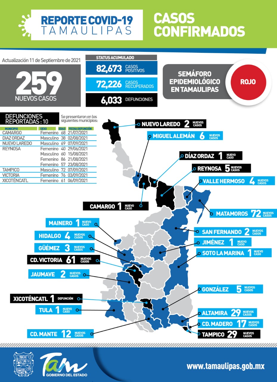 CIUDAD VICTORIA, Tamaulipas. – Tras confirmar 259 nuevos contagios de COVID-19 durante la jornada de este sábado, la secretaria de salud de Tamaulipas, Gloria Molina Gamboa reiteró la importancia de evitar sitios aglomerados, utilizar cubrebocas y mantener una distancia de 2 metros o más con otras personas para evitar la transmisión de la enfermedad.