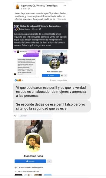 “No es la primera vez que éste perfil postea ofertas similares, y cuando pides información te sale con ofertas sexuales. Aunque el perfil es falso, existe una gran sospecha de que el perfil real es a nombre de ALAN ALEXIS DIAZ SOSA. No caigan en publicidad engañosa, no existe el trabajo sexual, es solamente explotación de mujeres”.