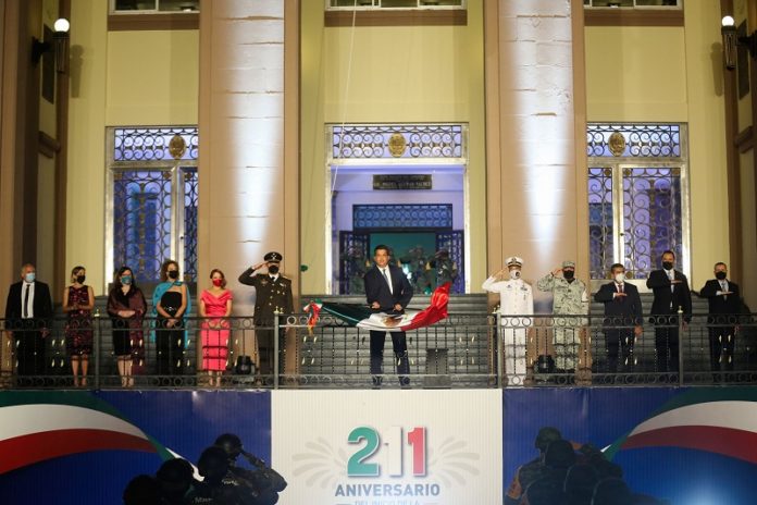 Por segundo año consecutivo la ceremonia del Grito de Independencia se realizó sin público en la Plaza Juárez de Ciudad Victoria, derivado de la pandemia por Covid-19, con el fin de garantizar la salud de las familias tamaulipecas evitando la aglomeración de personas durante las festividades patrias.