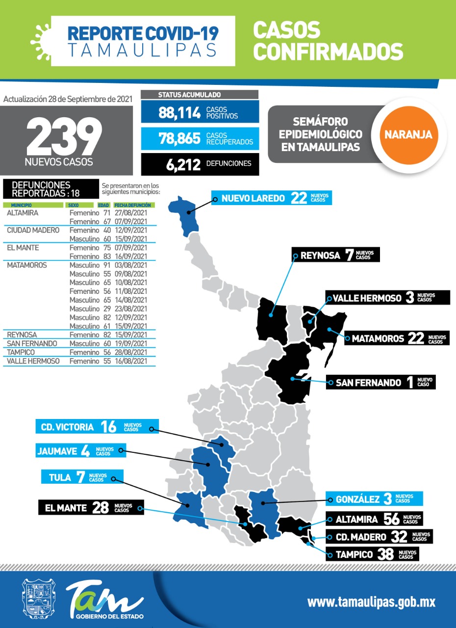 Al presentar el reporte diario, la funcionaria estatal confirmó 239 nuevos casos y 18 fallecimientos, por lo que reiteró el llamado a atender en todo momento las disposiciones emitidas por el gobierno de Tamaulipas a través del Comité Estatal de Seguridad en Salud para desacelerar la transmisión del virus, disminuir fallecimientos y complicaciones graves.