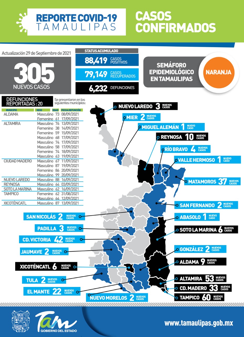 Tamaulipas continúa en semáforo epidemiológico naranja, que indica un nivel de riesgo alto con actividades que se abren de forma gradual pero continuando con las medidas obligatorias de uso del cubrebocas, el lavado frecuente de manos, la sana distancia y otras, que establece el decreto oficial.