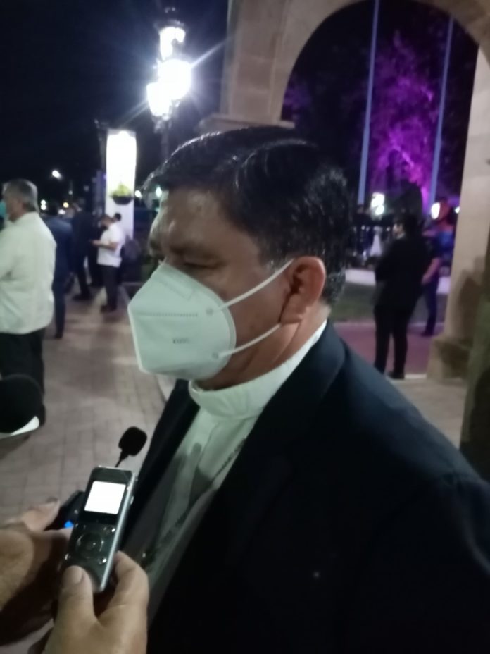 Nuevo Laredo, Tamaulipas.- El obispo de Nuevo Laredo, Enrique Sánchez Martínez, quien asistió a la toma de protesta de Carmen Lilia Canturosas como presidente municipal, comentó estar listo para seguir trabajando juntos en las cosas que se puedan realizar de esa manera, pero siempre por buscar el bien común de la sociedad, pero dijo que actualmente se requiere reivindicar la política y hacer esta misión y vocación, más digna, “y eso se hace con trabajo y con honestidad”, expresó.