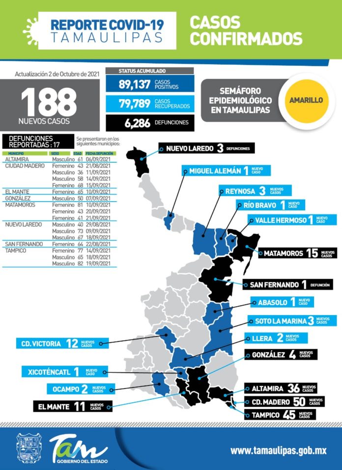 Ciudad Victoria, Tamaulipas.- Tamaulipas cerró la jornada de este sábado con 188 nuevos contagios de COVID-19 y 17 fallecimientos, informó en su reporte diario la secretaria de Salud, Gloria Molina Gamboa quien reiteró el llamado a mantener el control de enfermedades como obesidad, hipertensión y diabetes para disminuir el riesgo de complicaciones graves.
