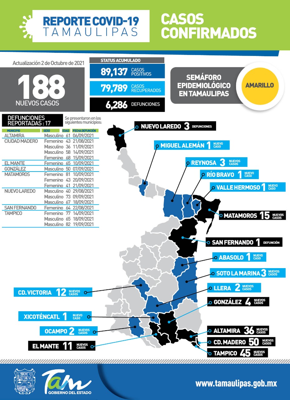 Añadió que Tamaulipas se encuentra en semáforo epidemiológico color amarillo, por lo que pidió atender las medidas de prevención ya conocidas para reducir la probabilidad de contagios, disminuir casos, hospitalizaciones y fallecimientos.