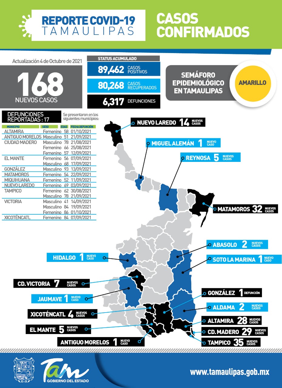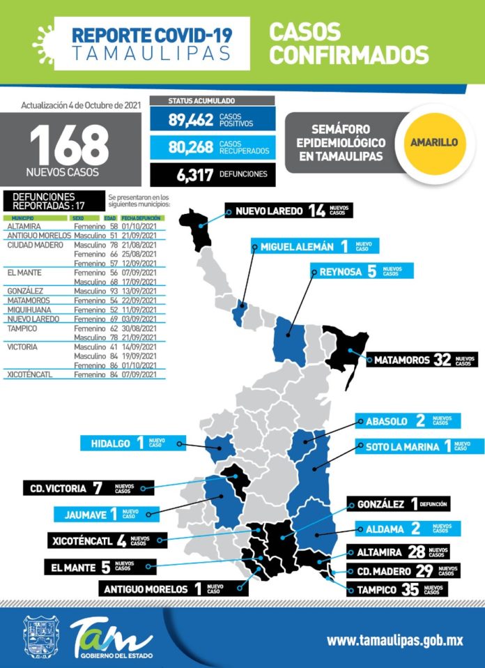 CIUDAD VICTORIA, Tamaulipas.- La pandemia de COVID-19 en Tamaulipas sumó hoy 168 pacientes positivos a COVID-19 y 17 fallecimientos asociados a complicaciones graves, informó desde esta ciudad capital la secretaria de Salud, Gloria Molina Gamboa quien insistió en su llamado a no bajar la guardia ni relajar las medidas preventivas ya conocidas para desacelerar la transmisión del virus.