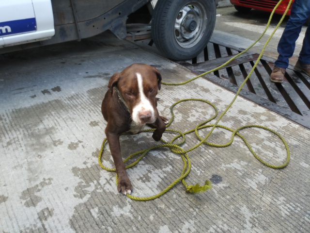 Tampico, Tamaulipas.-Tras más de una de esfuerzo elementos del Cuerpo de Bomberos de Tampico lograron rescatar hoy a un perro Pitbull, que se encontraba atrapado en un dren pluvial, en la calle Esperanza, casi esquina con Sor Juana Inés de la Cruz, en la zona centro de Tampico.