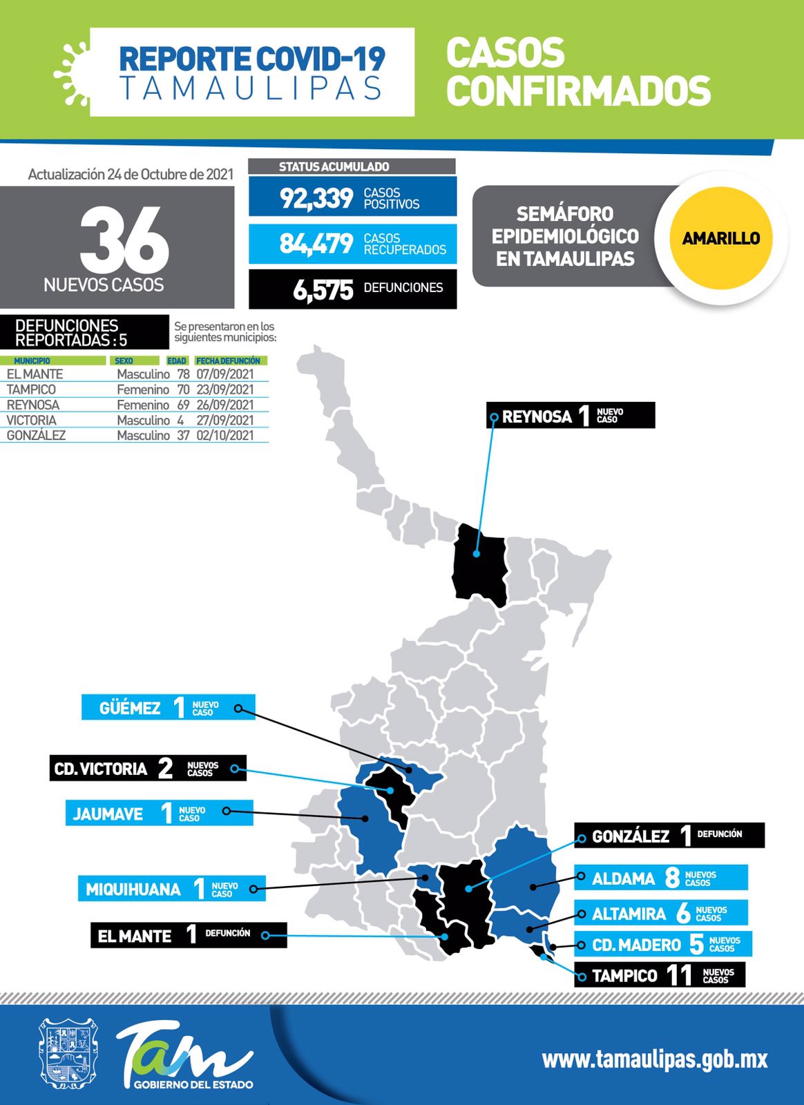 CIUDAD VICTORIA, Tamaulipas.-Tamaulipas cerró la jornada de este domingo con 36 nuevos casos de COVID-19 y 5 fallecimientos por complicaciones graves de la enfermedad, informó la secretaria de Salud, Gloria Molina Gamboa luego de convocar a la población y en especial a los jóvenes, a reforzar las medidas preventivas contra el virus.