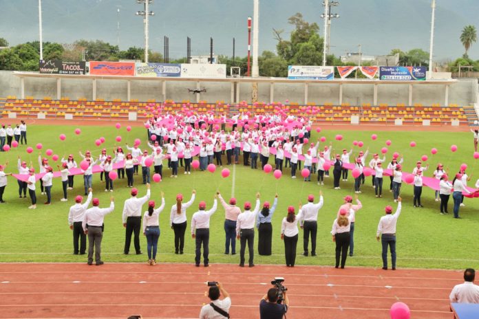 La titular de la SST presidió en esta ciudad capital las actividades de la campaña #ContraElCáncerYoActúo con la formación de un Lazo Rosa Humano para crear conciencia sobre la importancia de la prevención, el diagnóstico oportuno y el tratamiento adecuado del cáncer de mama.