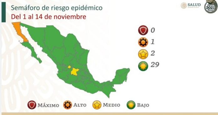 Precisa que 28 estados de la República mexicana estarán en color verde, 2 en color amarillo, 1 en color naranja y ninguno en color rojo.