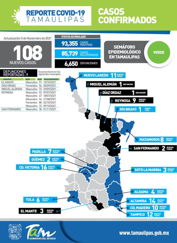 CIUDAD VICTORIA, Tamaulipas.- Tamaulipas cerró la jornada de este viernes con 108 casos de COVID-19 y 9 fallecimientos, informó la secretaria de Salud, Gloria Molina Gamboa al reiterar su llamado a atender en todo momento las medidas preventivas ya conocidas tanto en el hogar, el trabajo y los espacios públicos.