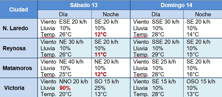 Se prevé a partir del Sábado temperatura máxima de 28°C y mínimas de 13°C, con viento moderado de dirección norte de 15-20 km/h con rachas que podrían superar los 40 km/h principalmente en zonas costeras. Se mantendrá clima frio en zonas altas (mínima de 4°C durante la noche en Miquihuana). Alta probabilidad de lluvia ligera a moderada puntual durante el ingreso del fenómeno.