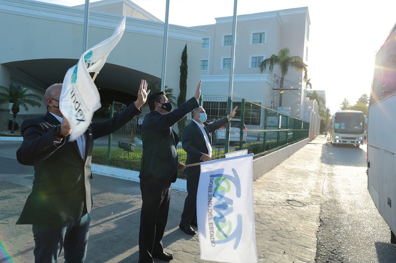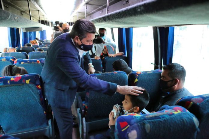 El gobernador Francisco García Cabeza de Vaca participó en Reynosa en el banderazo de arranque de las unidades que transportarán diariamente a 500 menores de 5 a 17 años de edad a territorio estadounidense para recibir la vacuna contra el Covid- 19, hasta alcanzar una meta de 40 mil niños y jóvenes inmunizados, hijos de trabajadores del sector maquilador.