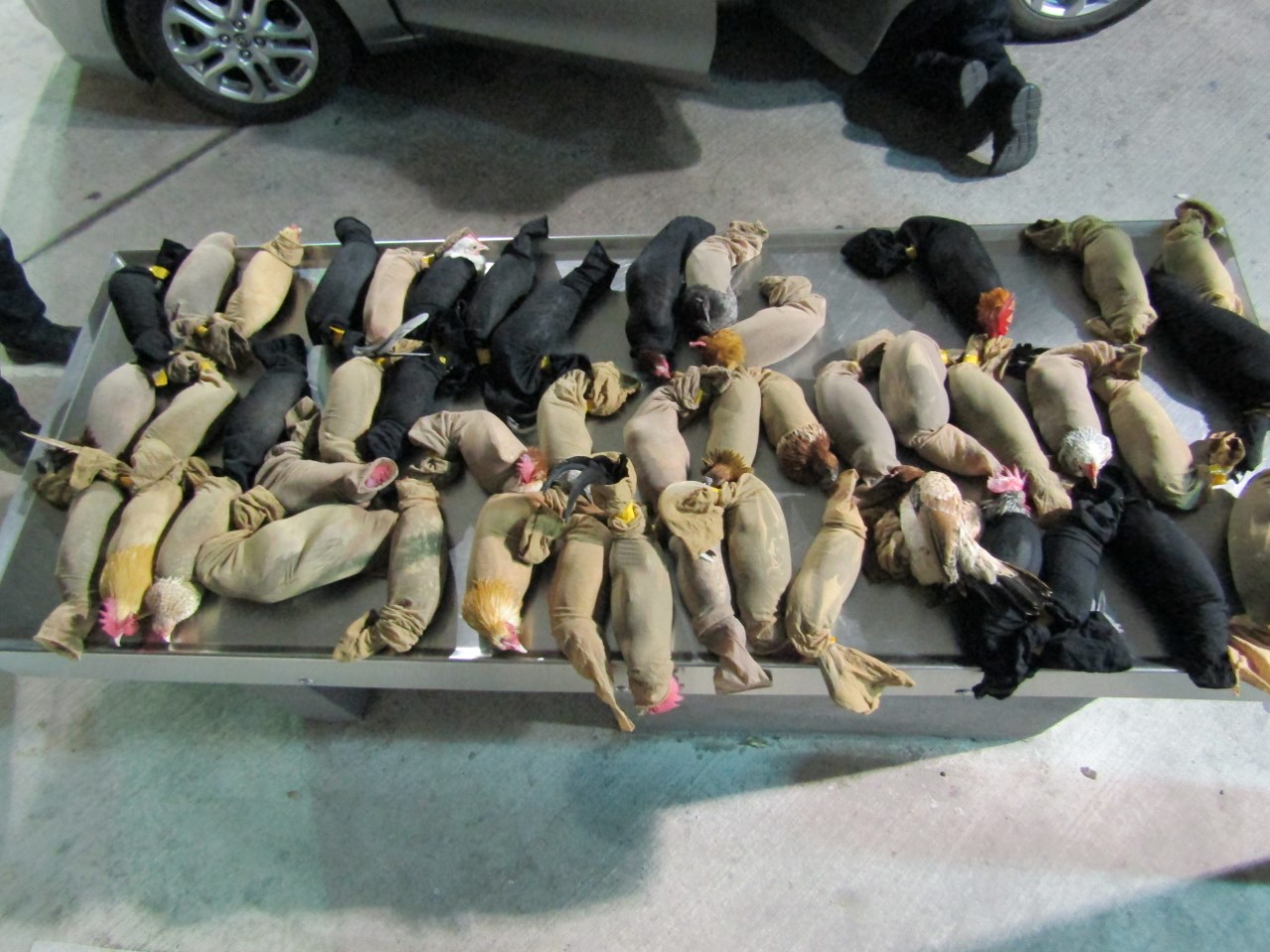 Las aves de corral estaban vivas todas, aunque envueltas en medias de seda para evitar el movimiento y reducir el volumen, y fue justo cuando el sujeto ingreso al carril Sentri, cuando fue remitido para su inspección por los oficiales de aduanas, en que al ser enviado a una revisión más rigurosa, se detectaron los gallos y gallinas de pelea.