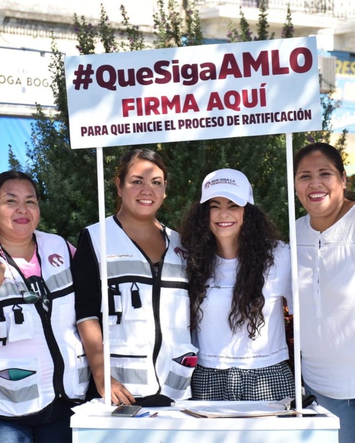 La tampiqueña acudió al módulo de la asociación “Que Siga la Democracia” para refrendar su apoyo al gobierno del presidente Andrés Manuel López Obrador y pidió a toda la ciudadanía participar en este instrumento inédito de la democracia, del cual dice, “llegó para quedarse” y propuso extender la revocación de mandato a los gobernadores a mitad de su administración.