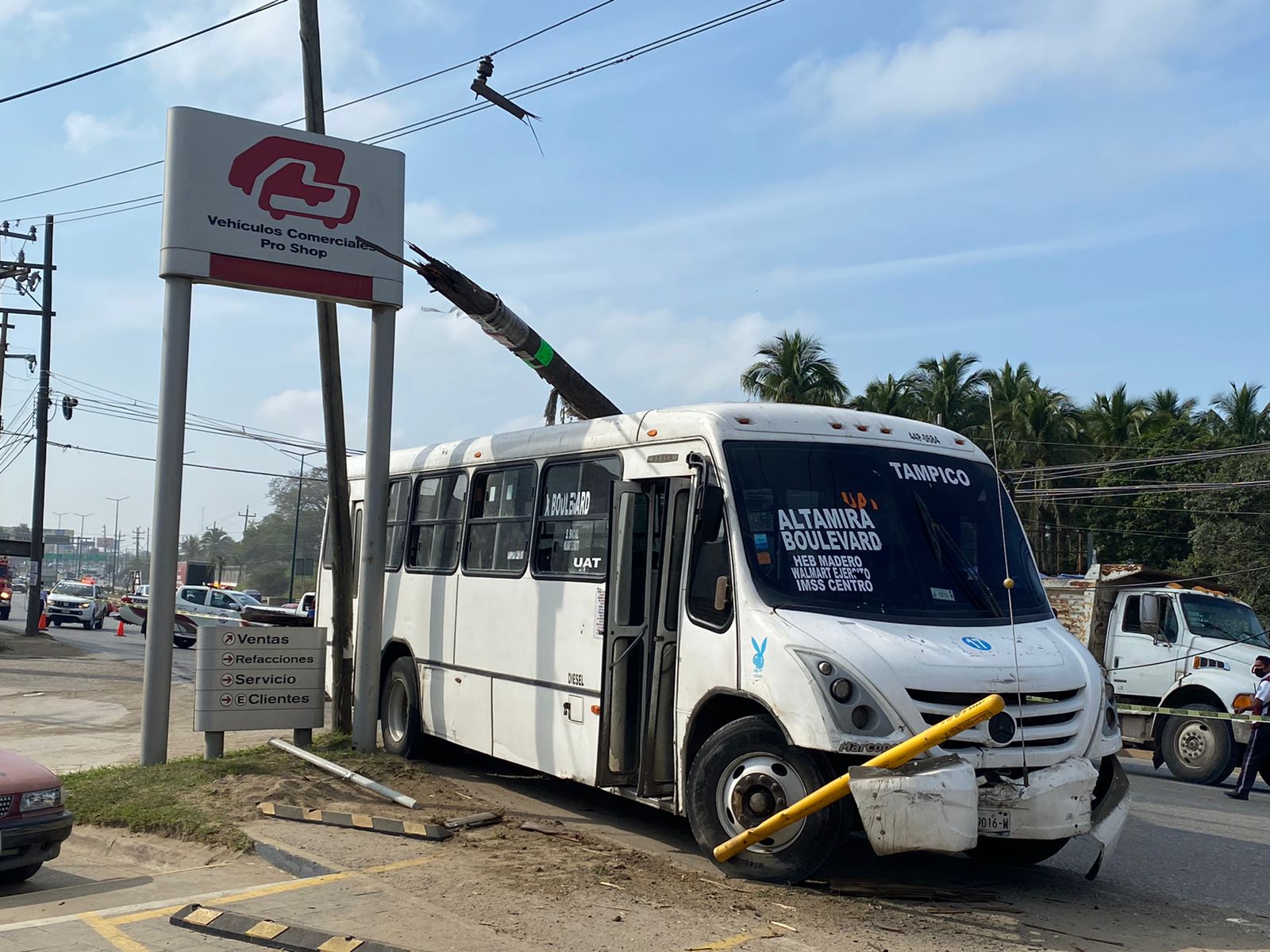Altamira, Tamaulipas.- Por ir distraído con el celular y conducir a exceso de velocidad, un chófer de la ruta Tampico Altamira por bulevar provocó tremendo percance vial sobre la avenida de la Industria a la altura de una concesionaria automotriz
