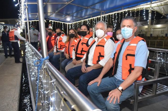 Tampico, Tamaulipas.-Con el propósito de ampliar la oferta turística en el municipio durante el periodo decembrino, el Presidente Municipal Chucho Nader puso en marcha el programa de recorridos náuticos navideños en el canal de la cortadura, a través de los pontones que prestan sus servicios en este paseo.
