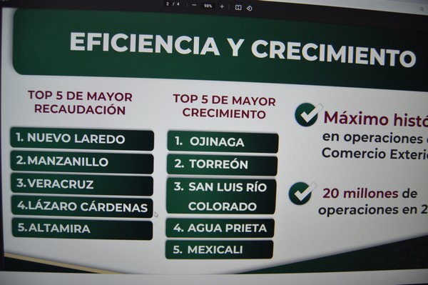 En cuanto al crecimiento de las aduanas en infraestructura, modernización y equipamiento, las cinco aduanas que figuran en el Top, son las de Ojinaga, Torreón, San Luis Río Colorado, Agua Prieta y Mexicali, pero en todas las aduanas se realizaron durante el presente año y hasta el 29 de diciembre, un total de 20 millones de operaciones.