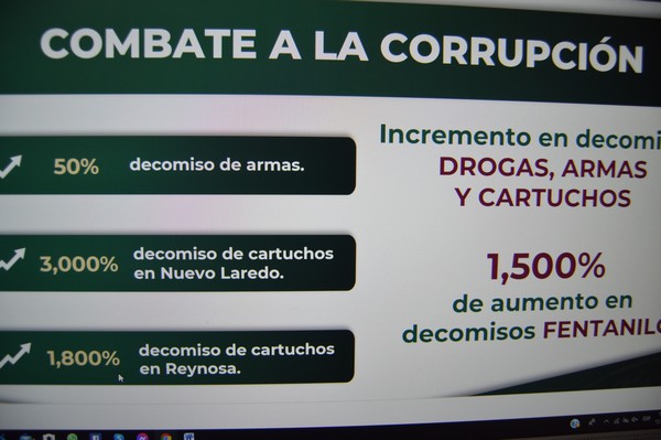 En lo que se refiere al rubro de combate a la corrupción, dicho informe revela que en cuanto al decomiso de armas el incremento a lo largo de este año fue de un 50 por ciento, mientras que en decomiso de cartuchos, en Nuevo Laredo estas acciones se incrementaron en un tres mil por ciento, en comparación con un mil 800 registrado en la aduana de Reynosa; el decomiso de drogas como el fentanilo fue del mil 500 por ciento en total.