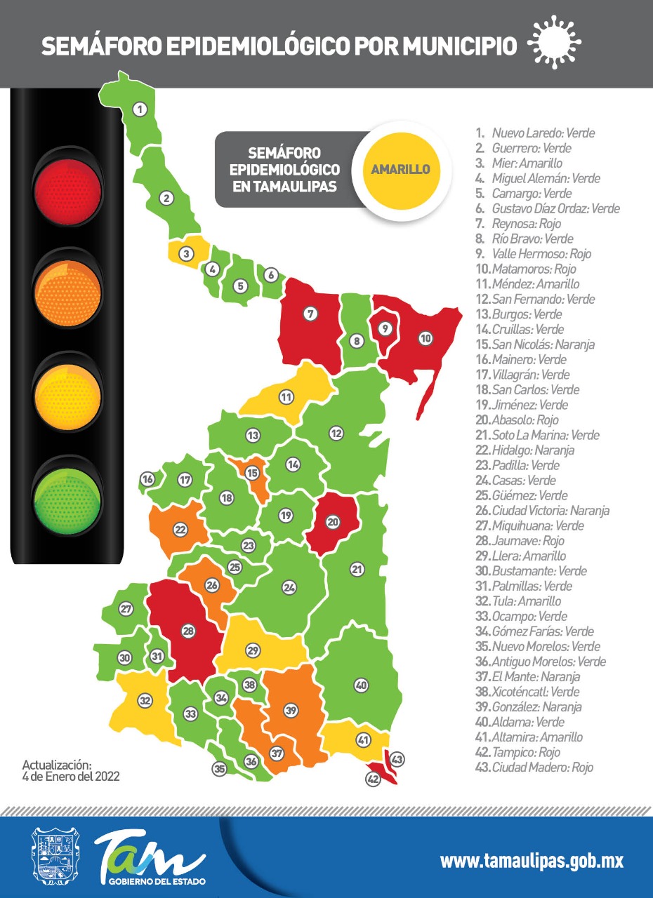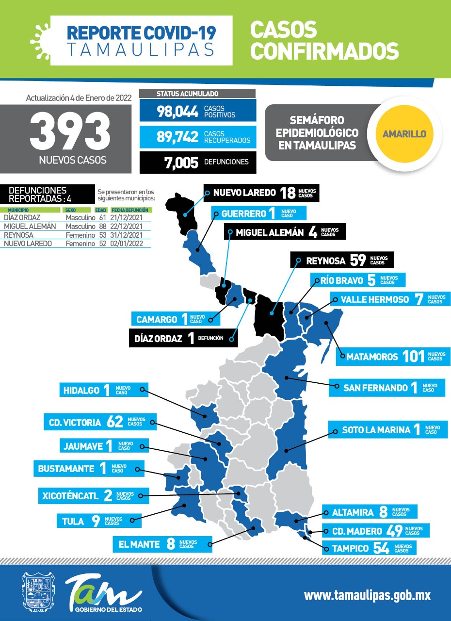 En cuanto a los decesos la dependencia puntualizó que fueron 4 registrados en, Díaz Ordaz, Miguel Alemán, Reynosa y Nuevo Laredo. En total suman 7 mil 05 las personas que lamentablemente han perdido la vida a causa del virus.