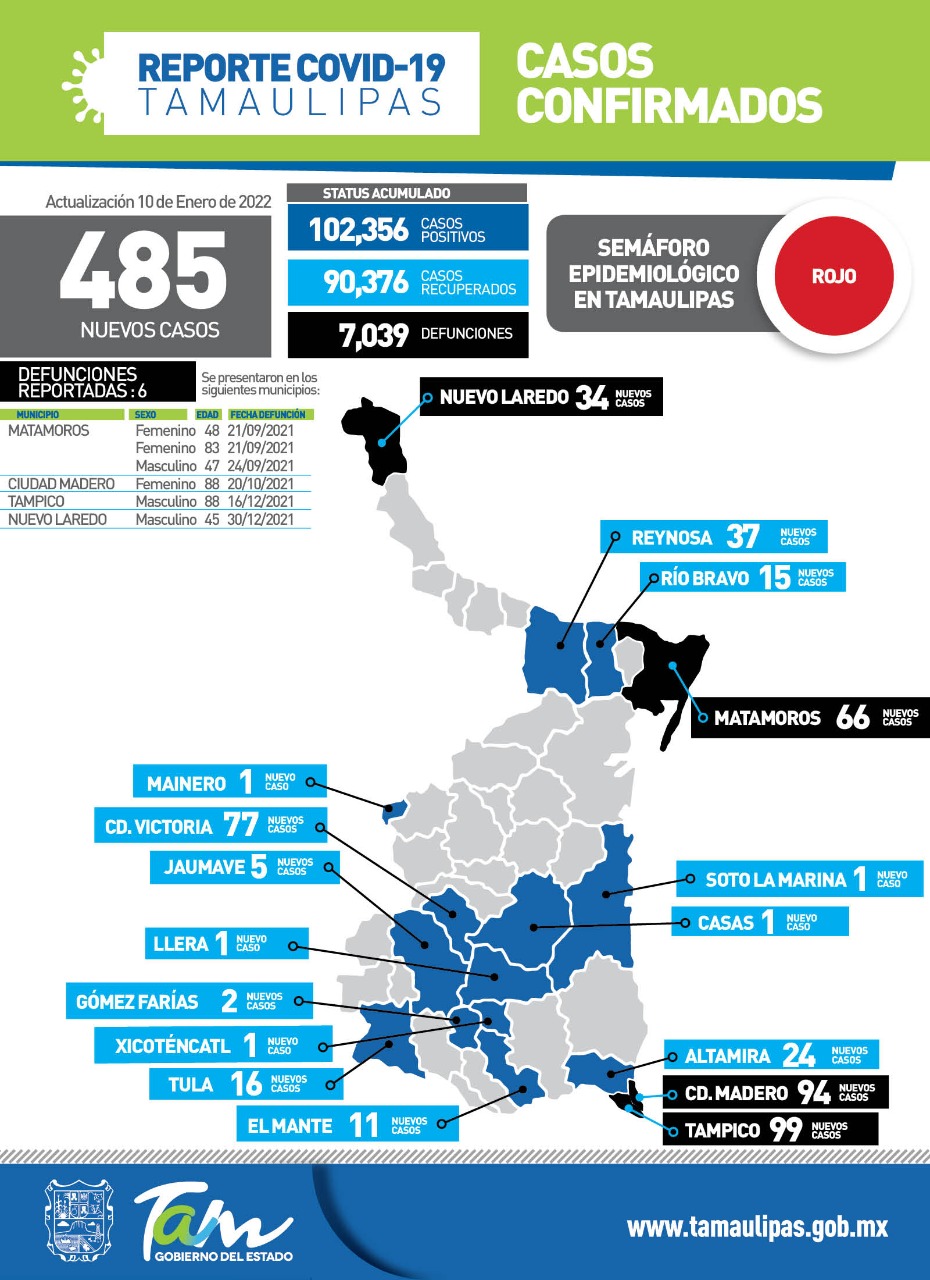 CIUDAD VICTORIA, TAMAULIPAS.-Tamaulipas cerró la jornada de este lunes con 485 positivos a COVID-19, 6 defunciones en pacientes con comorbilidades y en semáforo de riesgo epidemiológico color rojo, informó la secretaria de Salud, Gloria Molina Gamboa luego de hacer un llamado urgente a extremar las medidas de seguridad sanitaria para desacelerar la transmisión del virus.