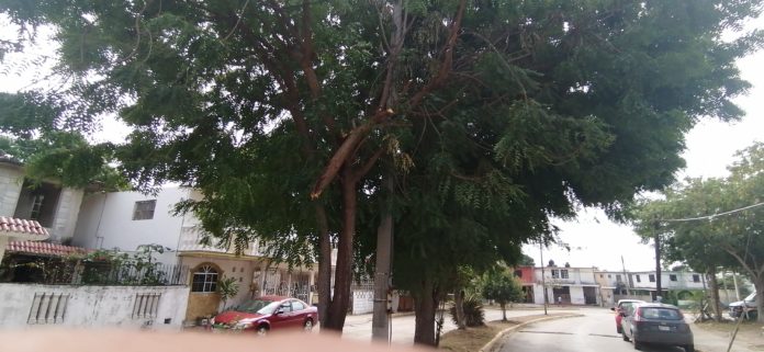 Altamira, Tamaulipas.-Vecinos de la colonia Infonavit Fidel Velázquez de Altamira solicitaron la intervención de las autoridades competentes para el retiro de una enorme rama de árbol que se encuentra sostenida del tendido eléctrico