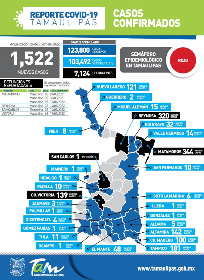 Ciudad Victoria, Tamaulipas.- Al presentar el balance oficial de la pandemia de COVID-19, la secretaria de Salud de Tamaulipas, Gloria Molina Gamboa confirmó 1522 nuevos casos y 6 fallecimientos, por lo que insistió en seguir actuando con responsabilidad para desacelerar la transmisión del virus.