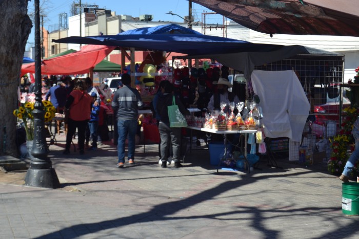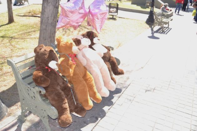 El puesto de Rosario Salazar ubicado en la plaza Hidalgo, ofrece regalos de todo tipo, pero los preferidos son los peluches, por lo que parejas de enamorados acuden a observar y, si pueden, comprar uno, según explicó esta vendedora quien dijo que es la primera vez que se coloca en este sitio.