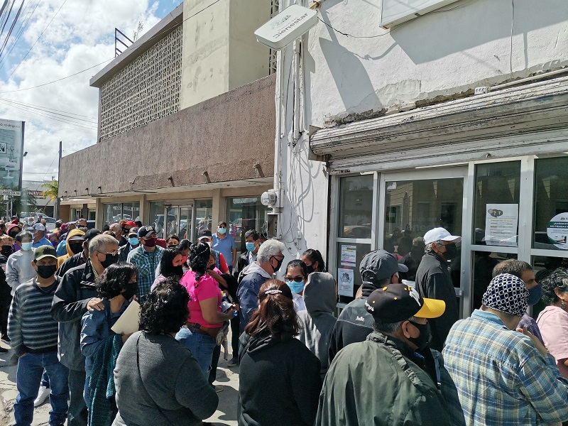 Matamoros, Tamaulipas.- Gran aglomeramiento se vivió este martes, dejando a un lado la sana distancia en las instalaciones del Banco del Bienestar del Gobierno Federal, cuando abuelitos de reciente incorporación al programa de apoyo gubernamental acudieron a cobrarlo.