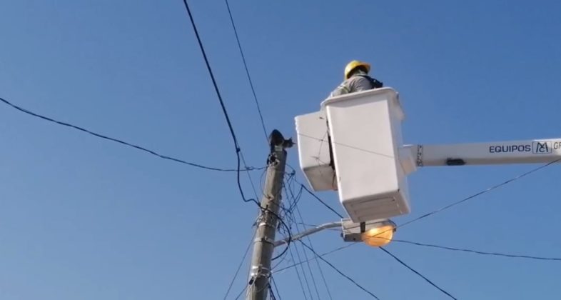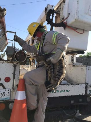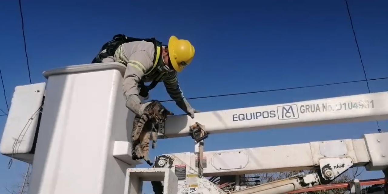 Matamoros, Tamaulipas.-Personal de la comisión Federal de Electricidad llegaron a rescatar a “Bengy” gatito que se encontraba atrapado en lo alto de un poste de alumbrado público desde el pasado martes.