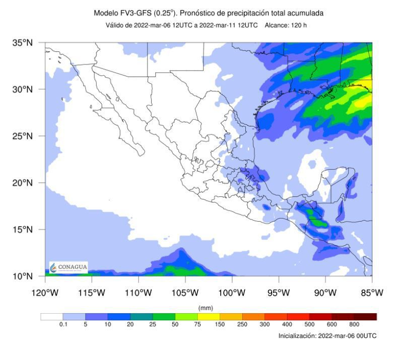 Durante este lunes 7 de marzo el nuevo frente frío (No. 34) ingresará al norte de México durante la mañana y recorrerá el noreste y oriente del país en el transcurso de la tarde, ocasionando lluvias e intervalos de chubascos.