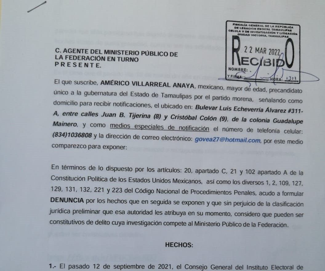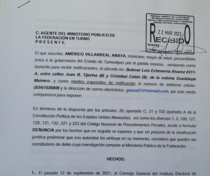 Cd. Victoria, Tamaulipas._ El precandidato de Morena a la gubernatura de Tamaulipas, Américo Villarreal Anaya presentó una denuncia de hechos ante la Agencia del Ministerio Público Federal contra quien resulte responsable por difundir videos falsos en redes sociales en los que se le involucra con la delincuencia organizada.