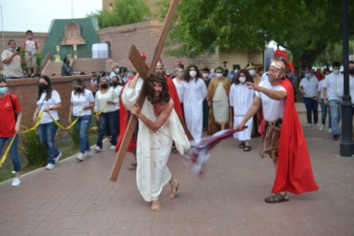 Nuevo Laredo, Tamaulipas.- Luego de dos años de haberse suspendido la representación de las Pasión y Muerte de Jesús, cerca de 200 personas, entre organizadores, participantes, amigos y curiosos, participaron en este sacro evento organizado por la Diócesis de Nuevo Laredo, en un recorrido cercano a los dos kilómetros, desde la plaza Esteban Baca Calderón, hasta la Catedral del espíritu Santo.