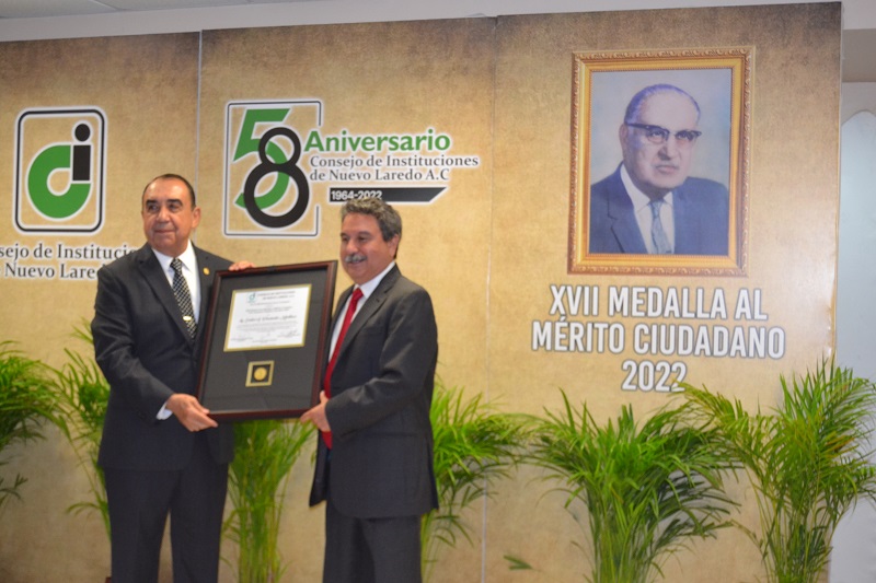 La directiva del Consejo de Instituciones a cargo de Fernando Rodríguez Garza, celebró el 58 Aniversario de su fundación en el restaurante ganadero de la Expomex, y ante importantes personalidades como empresarios, transportistas, comerciantes, políticos y funcionarios, le fue entregada la XVII Medalla al Mérito Ciudadano 2022 al transportista Carlos Alberto Fernández Martínez.