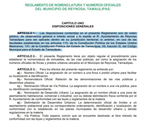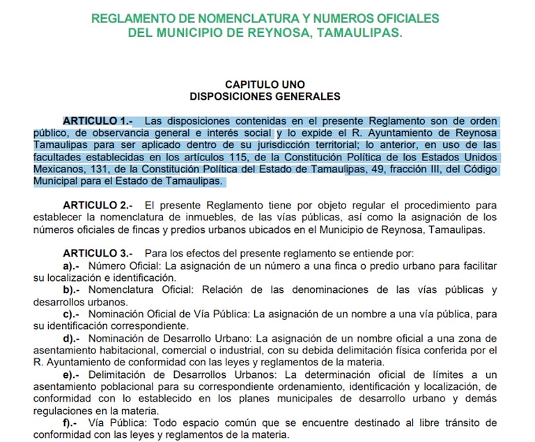 Dentro del Reglamento de Nomenclatura y números oficiales del municipio de Reynosa expedido por el Gobierno de Tamaulipas señala en su Capitulo Uno de disposiciones generales señala.