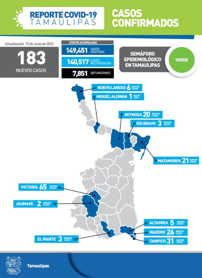 Ciudad Victoria, Tamaulipas.-La pandemia de COVID-19 en Tamaulipas sumó 183 nuevos casos a su conteo oficial durante la jornada de este miércoles, informó en su reporte técnico diario, la secretaria de Salud de Tamaulipas, Gloria Molina Gamboa.