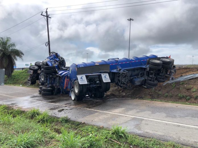 Altamira, Tamaulipas.-Un nuevo accidente de una pesada unidad se registró la madrugada de este martes en la zona industrial de Altamira en esta ocasión las alarmas de los equipos de emergencia se activaron debido a que un tráiler doble pipa de la compañía Trare Ysa sufrió una volcadura con 60 mil litros de diesel